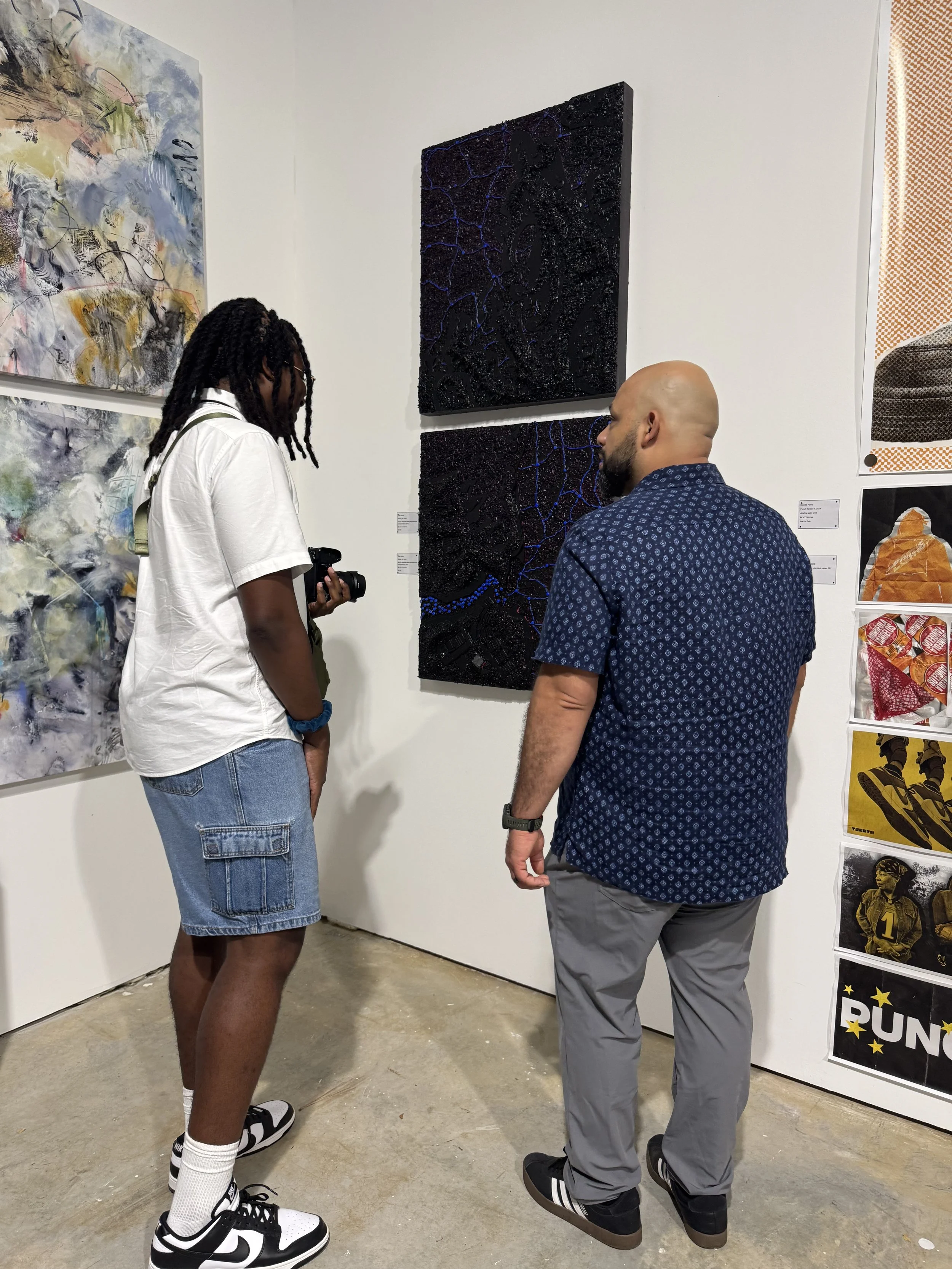 Two men are standing and discussing artwork in an art gallery. One man is holding a camera and wearing a white shirt and denim shorts. The other man is bald, with a beard, wearing a blue patterned shirt and gray pants. There are abstract paintings on the white walls.