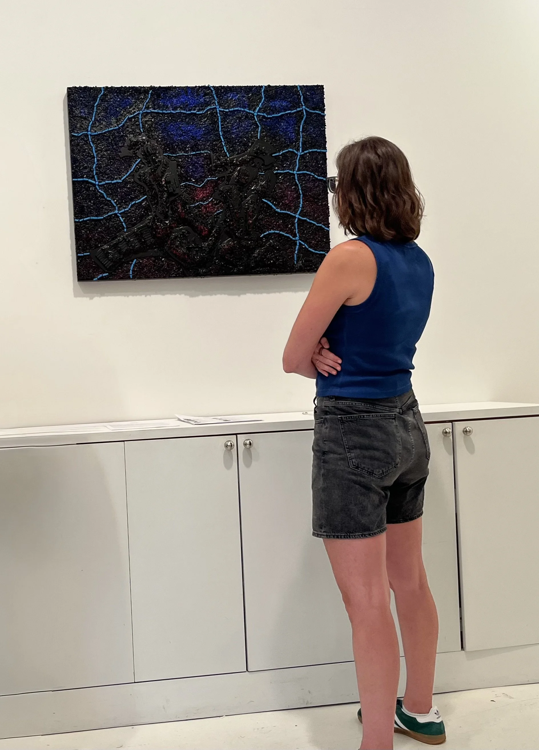 A woman with short brown hair, glasses, a sleeveless blue top, and black shorts standing in an art gallery, observing a black textured sculpture with blue lines on the wall.